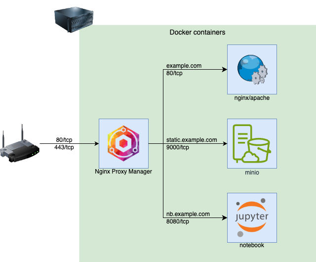 여기서는 집에서 소규모로 작게 운영하는 웹사이트들을 가정하고 설명하기로 한다. 실제 production 환경에서 사용하기 위해서는 더 나은 솔루션(AWS의 경우, WAF + ALB SSL termination 등)이 있기 때문에, 높은 트래픽과 높은 가용성이 필요로 하는 환경보다는 낮은 트래픽에 조금 더 쉽게 사용할 수 있는 운영환경에 초점을 맞추고 있다. 또한, 개인적으로 사용하는 homelab에는 서비스들을 docker container로 운영하고 있지 때문에, 여기서도 docker-compose를 이용하여 docker container로 운영하는 방식을 기준으로 설명한다. Docker container들끼리는 docker network로 통신하면 되므로, 개별 서비스에 직접 접근해야하지 않는 이상 각 서비스의 포트를 호스트에 직접 노출시키지 않아도 된다.